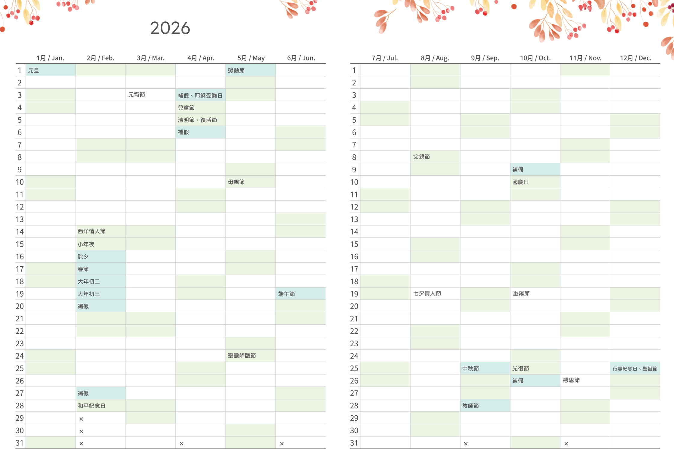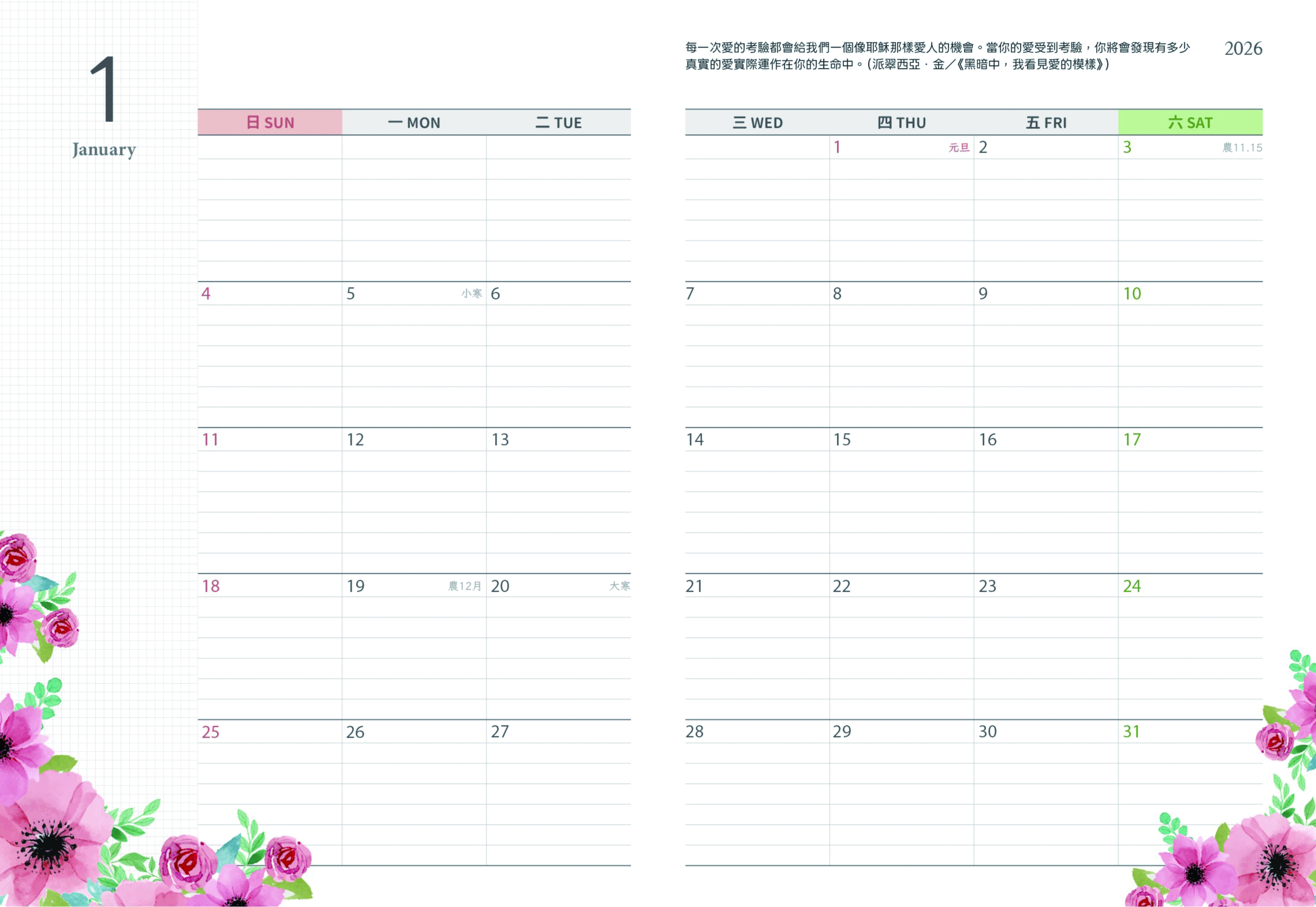 猶太曆標示:手冊內標示猶太曆節期,讓您在計畫中更加精確和全面。