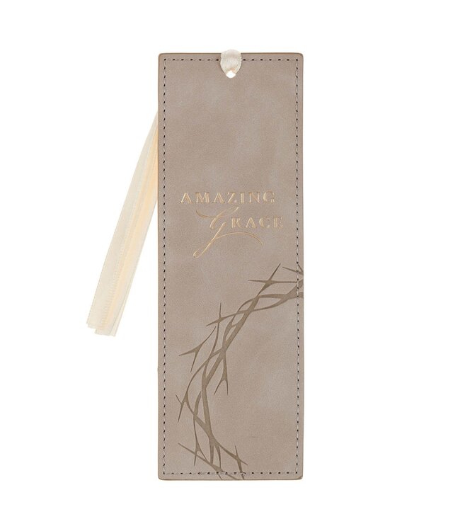 The Amazing Grace Taupe Faux Leather Bookmark is part of the Amazing Grace Taupe Crown of Thorns Collection, which includes coordinating pieces such as a paper bookmark with a tassel, a checkbook wallet, faux leather bookmark, faux leather Bible cover, faux leather journal, devotional, ceramic coffee mug, magnet set, spiral notebook, stainless steel water bottle, and gift bag.—all styled with warm taupe tones and Scripture-centered reminders of grace.