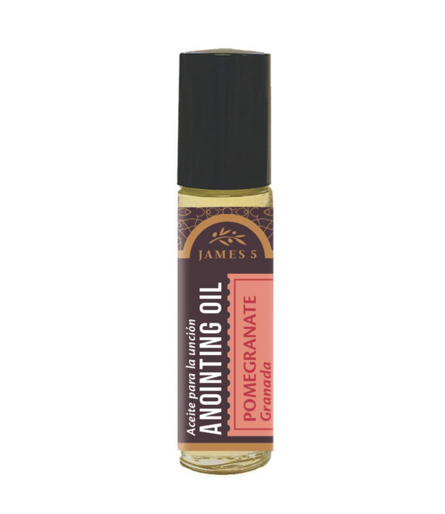 Broadman Church Supplies James 5: Anointing Oil - Pomegranate - Roll-On Applicator (Net Wt. 1/3 oz.) consists of 1/3 oz. of extra virgin olive oil and the fragrances of Pomegranate, packaged in a glass roll on vial which measures 3/4" x 3 1/4". The vial is topped with a roll on ball for easy no mess, no spill application, and screw tight plastic lid.