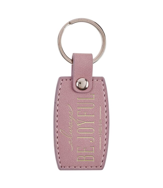 The Always Be Joyful Dusty Mauve Faux Leather Keychain is part of the Joyful Dusty Mauve Collection, this keychain coordinates beautifully with matching pieces designed to spark joy and gratitude in your day—a mini magnetic calendar, small daily planner, scented candle in a glass jar, checkbook wallet, ceramic mug, spiral journal, faux leather Bible cover, classic journal, tote bag, stainless steel water bottle, and gift bag.