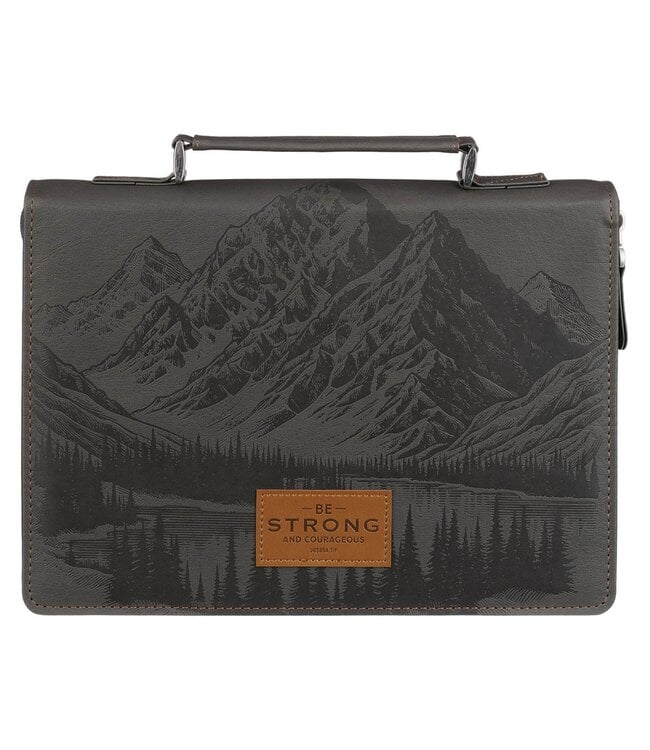 The Be Strong and Courageous Charcoal Gray Faux Leather Classic Bible Cover is made for adventurous men who face life with faith and courage.