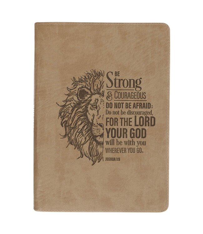 The front cover features a lightly mottled tan faux leather that gives it a rugged, worn-in feel. A detailed heat-debossed illustration of a lion’s face rises from the left side, while the right side features layered heat-debossed text from Joshua 1:9.