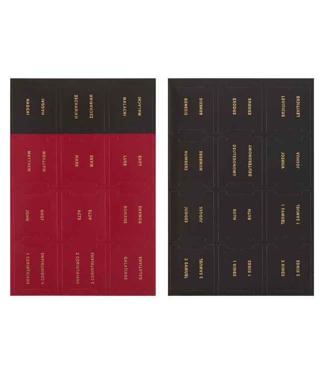 Use the Black and Red Old and New Testament Bible Indexing Tabs to easily distinguish between the Old and New Testament books of the Bible. These two-color tabs clearly differentiate the Old Testament from the New and act as a visual guide for exploring your Bible.