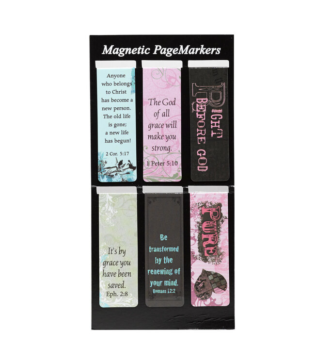 The Grace Magnetic Bookmark Set contains 6 magnetic bookmarks decorated in coordinating hues of pink, brown, and teal. The designs carry over to the back of each magnet. Each bookmark displays a Scripture verse or encouraging statement.