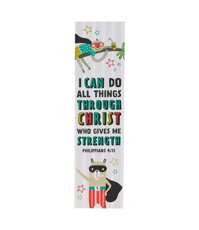 A reclining cartoon sloth and a raccoon superhero boldly proclaim the sentiment of these bookmarks in bold teal and black letters, reminding kids that they can do all things through Christ, who gives them strength.