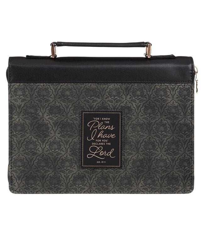 The I Know the Plans Black Floral Faux Leather Classic Bible Cover is part of the I Know the Plans Graphite Floral Collection, created to celebrate milestones and encourage women with God's promise of a bright future. Pair it with the matching journal, mug, notebook, devotional, bookmark, or gift bag for a beautiful coordinating gift.