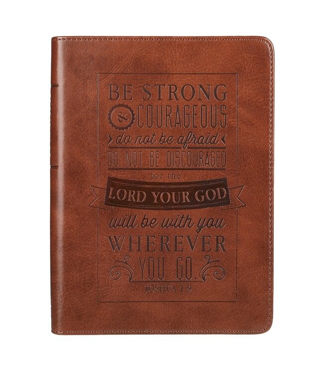 The Be Strong and Courageous Saddle Tan Hany-size Faux Leather Journal will be your personal reminder that God is rooting for you. When life gets us down, we need to hear the words "take courage." We need to know someone is rooting for us. God promises that He will be with you wherever you may go.