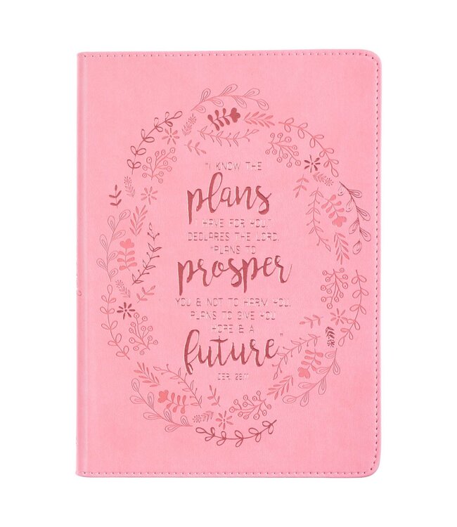 The smooth pink faux leather cover is debossed with a floral leaf wreath encircling the complete Scripture verse from Jeremiah 29:11.