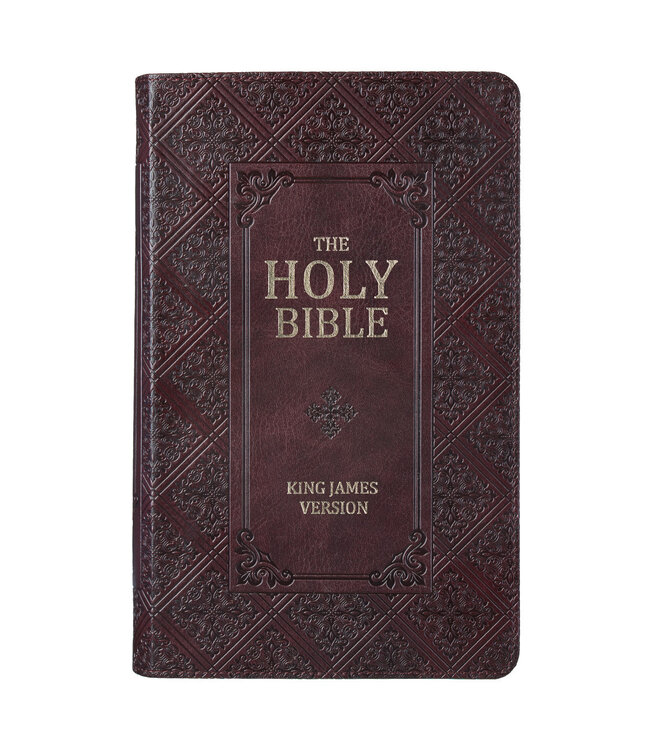 The exquisitely designed cover of the Dark Brown Faux Leather Giant Print King James Version Bible with Thumb Index reflects the importance of its content.