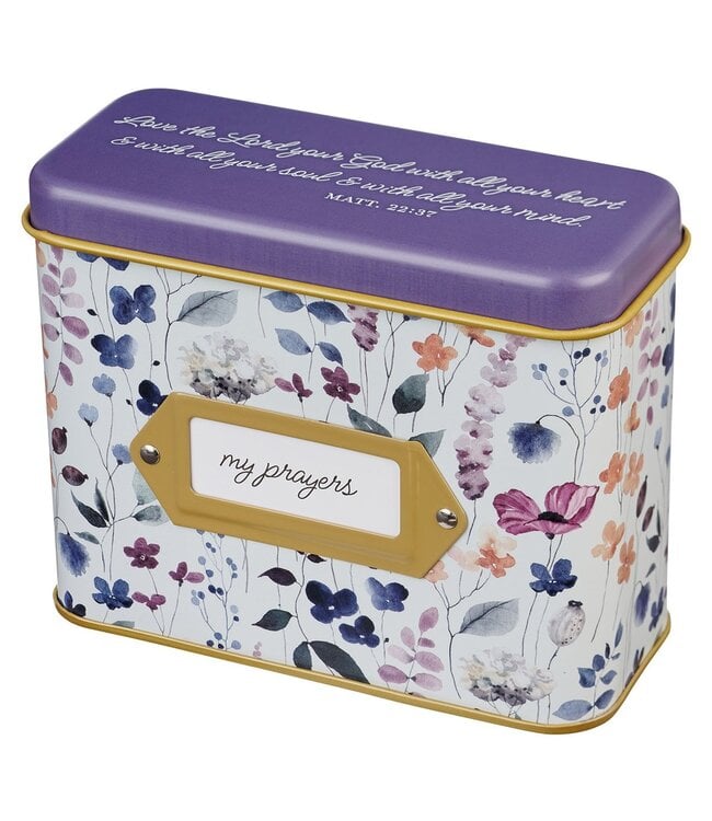 A beautiful wildflower design decorates the exterior of the brass metal tin. A white label in the brass label holder on the front of the tin states, "My Prayers." The hinged purple lid features a Scripture verse in white scripted letters.