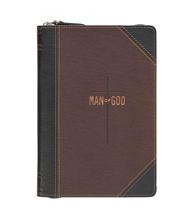 The Man of God Brown and Black Faux Leather Journal with Zipper Closure is part of the Man of God Brown Trailhead Collection, which also includes a devotional, keychain, genuine leather wallet, phone wallet, ceramic coffee mug, stainless steel travel tumbler, stainless steel water bottle, photo frame, gift pen, spiral journal, journal cover with inset, classic journal, and coordinating gift bag.