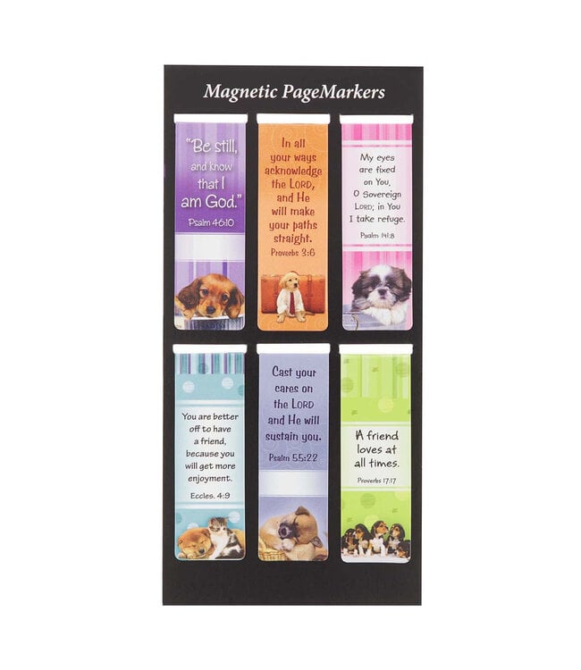 The Magnetic Bookmark Set contains 6 magnetic bookmarks decorated with pictures of the most adorable puppies. The colorful background designs carry over to the backs of the bookmarks. Along with the cute puppy images, each bookmark displays an encouraging verse from Scripture.