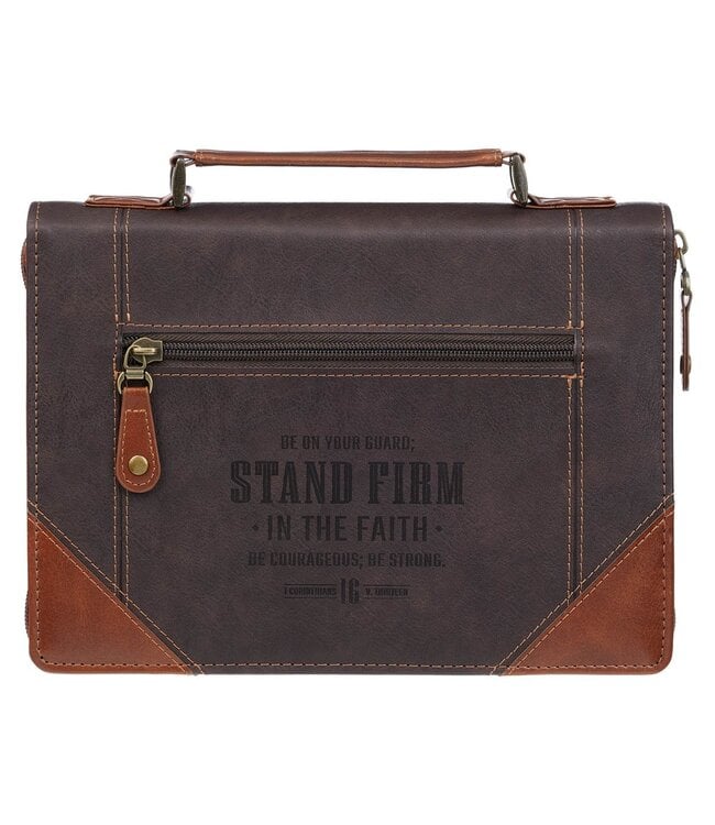 Carrying your Bible in the Stand Firm Espresso and Honey-brown Faux Leather Classic Bible Cover will be a daily reminder to stay watchful, stand firm in the faith, and draw your strength from the Lord who goes with you.