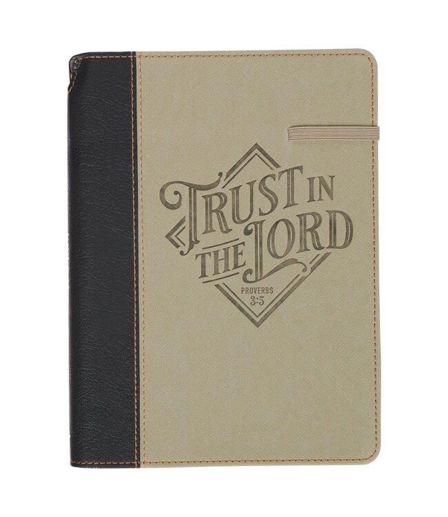Keep your pen handy and your thoughts organized with the Trust in the Lord Black and Sand Faux Leather Classic Journal with Pen Holder. This journal is perfect for the dedicated writer who loves both style and practicality.